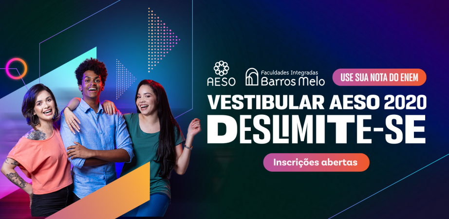 As Faculdades Integradas Barros Melo (AESO) realizam Processo Seletivo/Vestibular para ingressos no ano de 2020. As inscrições para as provas estão abertas e podem ser feitas pelo site www.barrosmelo.edu.br/vestibular. É cobrada uma taxa de R$ 20,00. O exame acontece dias 23 e 31d e Janeiro de 2020 (com início às 15h), na sede da instituição, Av. Transamazônica, 405, Jardim Brasil II – Olinda/PE. Informações: 2128.9797.