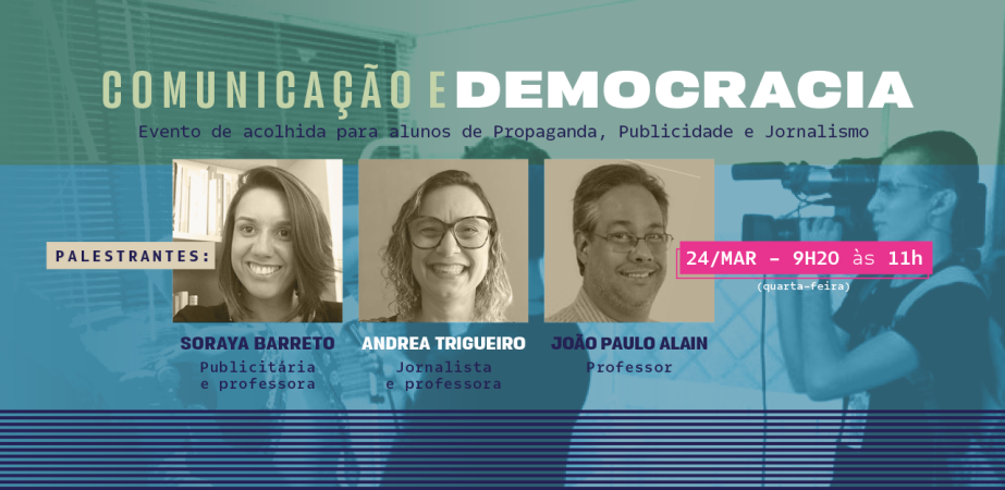 Dia 24 de março, representes das áreas de Jornalismo, Publicidade e Propaganda e Direito se reúnem para debater sobre a função social e democracia no campo da Comunicação. Será a partir das 9h20, via Google Meet. O evento marca o início do semestre e objetiva ampliar a visão dos estudantes sobre a temática.