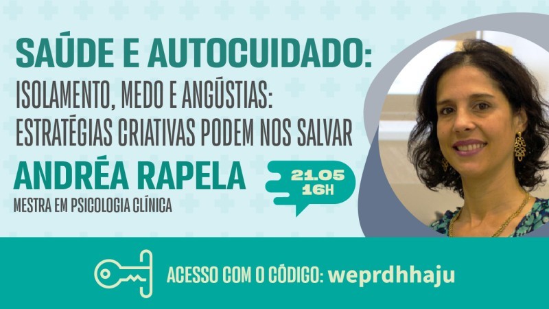 Para este segundo momento, a psicóloga e psicoanalista Andréa Rapela aborda o tema “Isolamento, medo e angústias, estratégias criativas podem nos salvar”. O evento acontece dia 21/05, às 16h, através