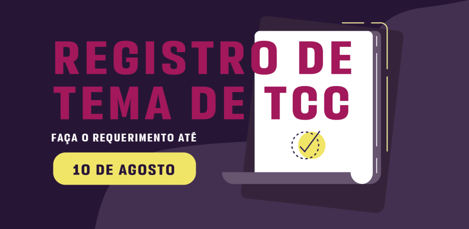 Os estudantes que apresentarão o Trabalho de Conclusão de Curso, neste semestre, devem registrar o tema, no Portal do Aluno, até o dia 10 de agosto de 2020. Para fazer o procedimento, basta acessar o Portal, procurar a página de Requerimentos, optar pelo TCC e preencher as informações necessárias.